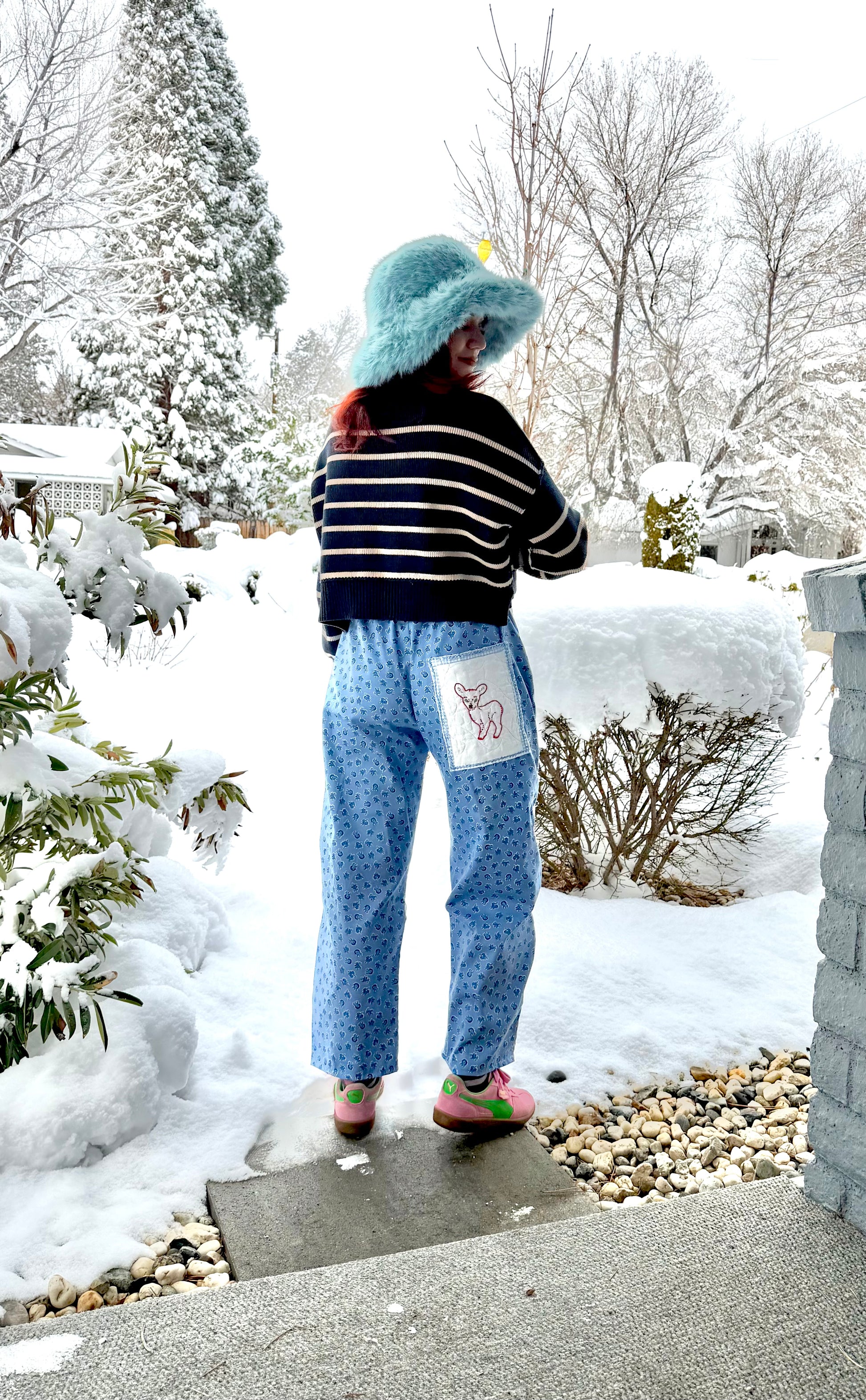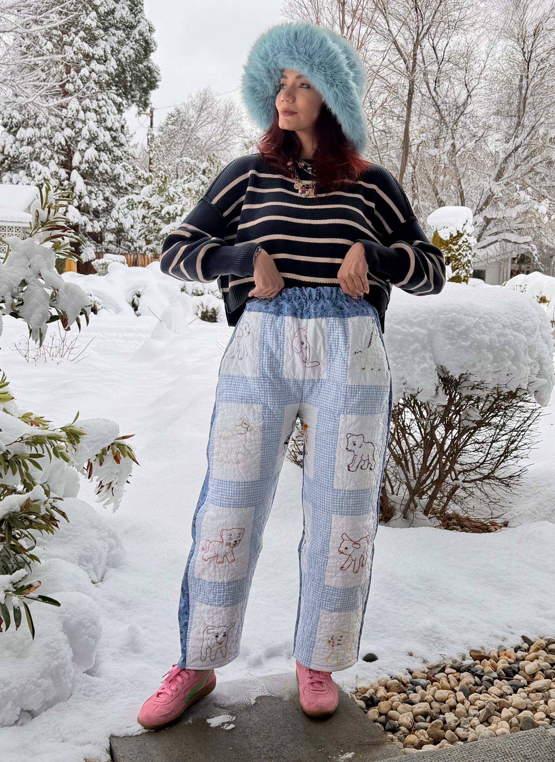 One-of-a-kind pants made from vintage quilted cotton on the front, reworked into a wearable piece of textile art with cotton vintage fabric in the back. The quilted fabric gives these pants soft structure, warmth, and texture while showcasing the charm and craftsmanship of vintage quilting techniques.
