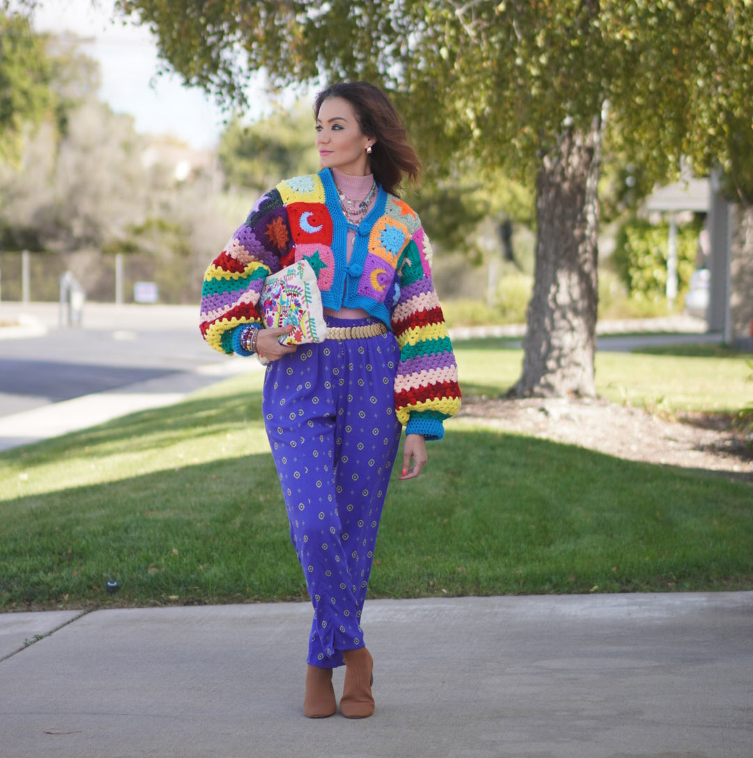 The Celestial Cardigan is a true statement piece, handmade with intention, color, and a little cosmic magic. Featuring unique celestial inspired granny squares and bold striped sleeves, this piece celebrates individuality, creativity, and sustainable fashion.